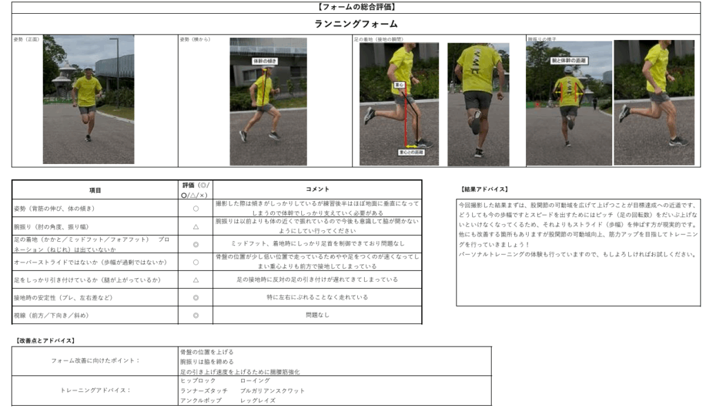 撮影した画像を見ながら、ランニングフォームの分析とフィードバックをいたします。後日、ランニングフォームの改善をまとめた分析シートをお送りします。